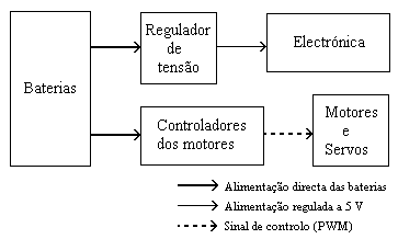 Estas baterias irão alimentar directamente os motores e irão alimentar toda a parte electrónica através de um regulador de 5 V.