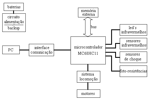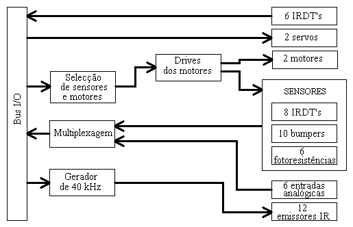 O robô é constituído por 28 sensores: 12 sensores de infravermelhos, 10 sensores de choque e 6 fotoresistências.